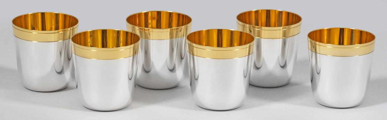 A set of six elegant German Sterling silver parcel-gilt vodka tumblers. Gilt inside. Standard mark 925.