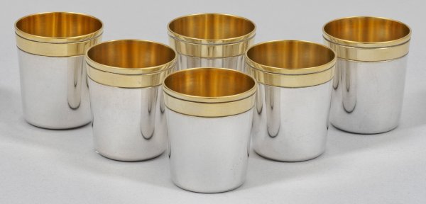 A set of six small German Sterling silver parcel-gilt cups. Gilt inside. Standard mark 925. Maker's mark.