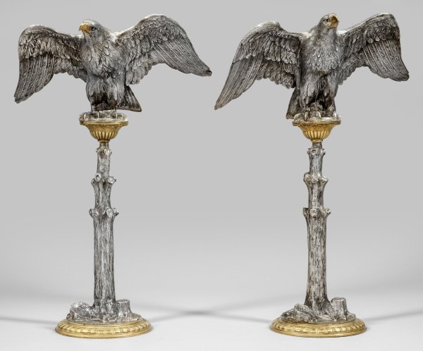 Silber, teilw. vergoldet. Von rechteckigen Godronen umzogener Rundstand. Zentral über naturalistisch gestaltetem Grund mit Blüten und Baumstümpfen ein aufsteigender Schaft in Form eines Baumstamms, in rundem Kapitell mit Godronen und Akanthusblattdekor endend. Darauf die vollplastische, äußerst fein und detailreiche Figur eines Adlers mit leicht ausgebreiteten Flügeln und reliefiert dargestelltem Gefieder. Standring, Kapitell und Schnabel vergoldet. Als Augen zwei applizierte Granatcabochons. Gest. 800, Herstellerzeichen. Gew. zus. ca. 4665 g. H. 53 cm.