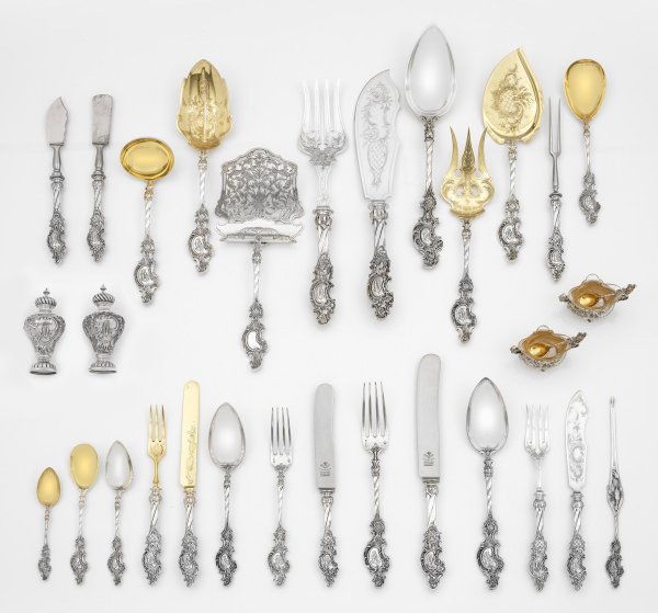 Silber, teilw. vergoldet, in originalem, zweitürigem Holzkasten mit fünf Schubladen. 399-tlg.; 24 Speisemesser, 36 -gabeln, 24 -löffel, 24 Menümesser, 24 -gabeln, 18 -löffel, 24 Fischmesser, 24 -gabeln, 24 Hummergabeln, 24 Dessertmesser, 24 -gabeln, 24 Eislöffel, 24 Teelöffel, 24 Mokkalöffel, 12 Salieren mit Glaseinsätzen und 12 passenden, kleinen Löffeln, 4 Salzstreuer und 29 Vorlegeteile wie z.B. Spargelheber, Vorlegelöffel, Fleischgabeln, Fischvorleger, Saucenkellen. Schmaler, in sich gedrehter Stiel, übergehend in geschweiftes Heft, beidseitig mit stark reliefplastischen Rocaillen, Gitterwerk und C-Schwüngen verziert sowie akzentuiert von zarten Blüten. Ovale Kartusche mit ligiertem Monogramm "OM" oder "MC" (?). Schneiden teilw. schauseitig mit feinem Gravurdekor. Teilw. Edelstahlklingen. Modell-Nr. 155/1891. Kasten mit korrespondierend monogr. Plakette. Gest. 800, Herstellerzeichen. Gew. zus. ca. 23270 g (Gew. ohne gefüllte Teile ca. 12930 g).