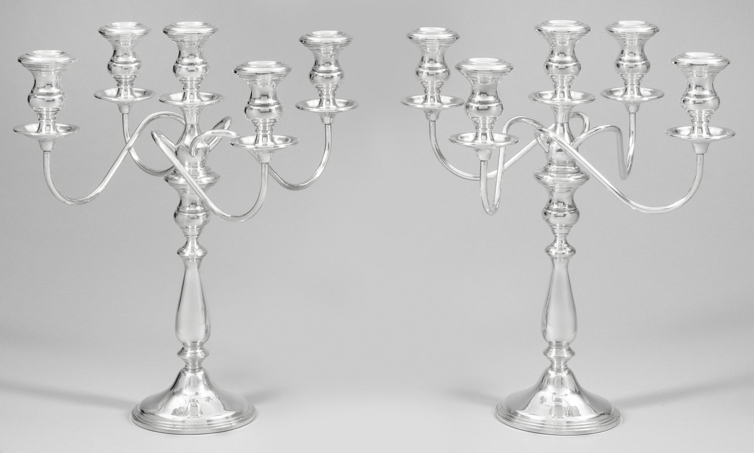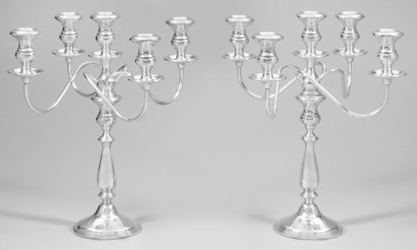 Sterlingsilber, beschwert. Am Rand mehrfach profilierter, trompetenförmig ansteigender Fuß, übergehend in glatten Balusterschaft und Tülle. Schraubbarer Aufsatz zentral mit verlängertem Schaft sowie mit vier geschwungenen Leuchterarmen, in balusterförmiger Tülle und gemuldeter Traufschale endend. Gest. "Sterling". Gew. zus. ca. 4790 g. H. 25 cm.