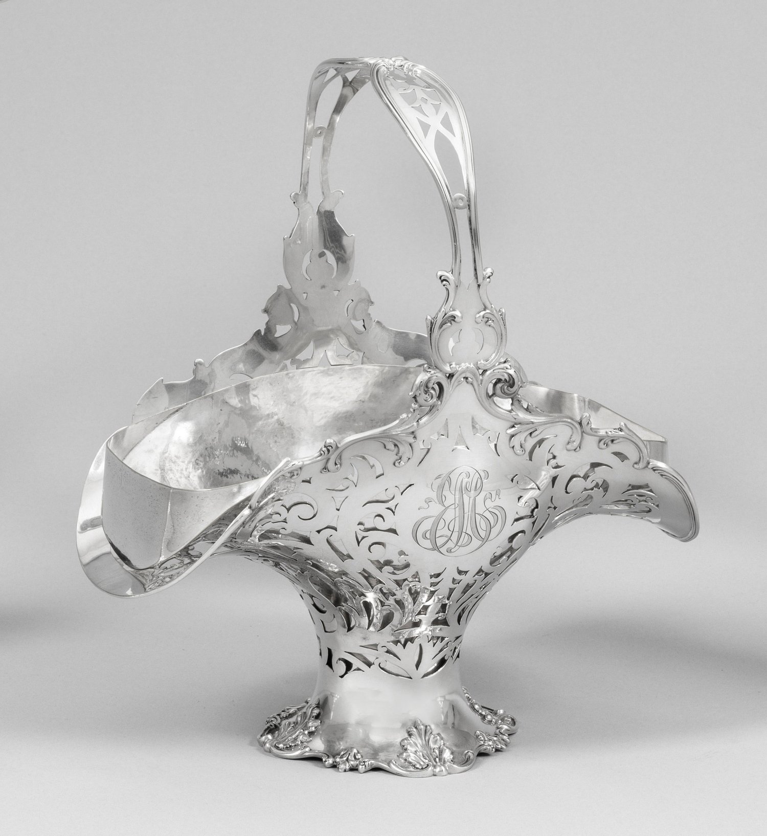 Sterlingsilber. Über passig geschweiftem, von Voluten umzogenem Stand schmaler Schaft mit seitlich weit ausschwingender Schale und passendem Einsatz. Die Wandung leicht bombiert und in Form von stilisierten Blattranken durchbrochen gearbeitet. Hoch aufsteigender Bandhenkel. Schauseitig auf ovaler Kartusche monogr. "EM". Gest. Sterling, Herstellerzeichen. Gew. ca. 905 g. H. 30 cm. 27,5 cm x 16 cm.