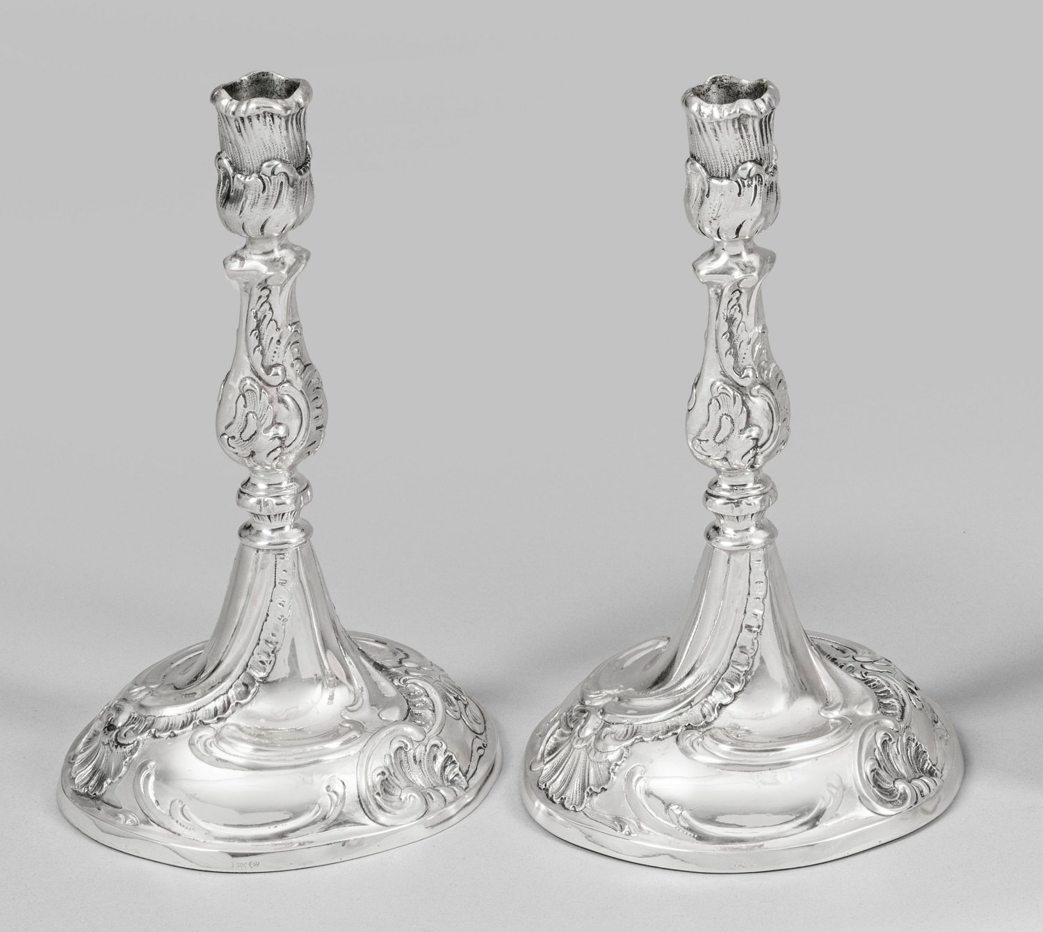 A pair of German Rococo style weighted silver candlesticks. Standard mark 800, maker´s mark.