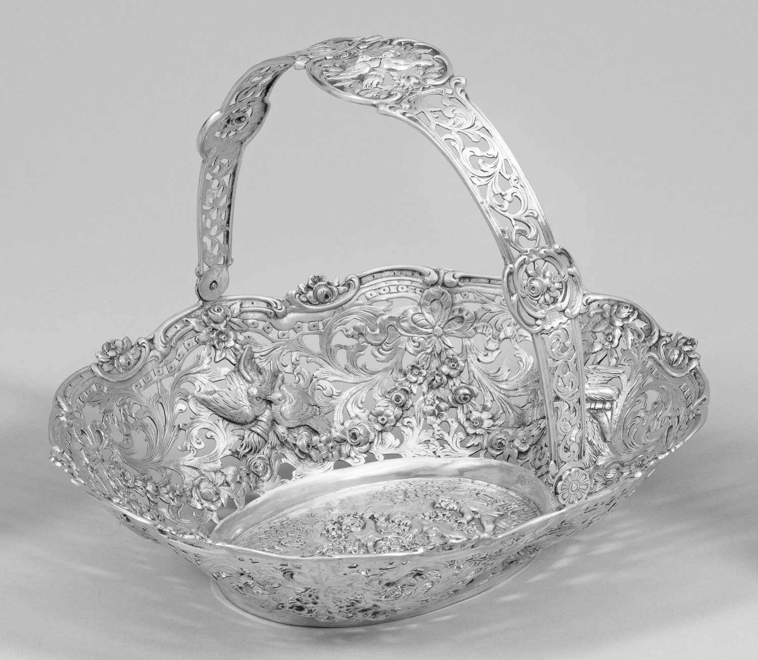 Die aufsteigende, durchbrochen gearbeitete Fahne verziert mit Blütenfestons, Voluten sowie je ein paar Turteltauben mit brennender Fackel. Übergreifender, beweglicher Bandhenkel korrespondierend durchbrochen gearbeitet. Gew. ca. 970 g. H. 26 cm. 28 cm x 22,5 cm.