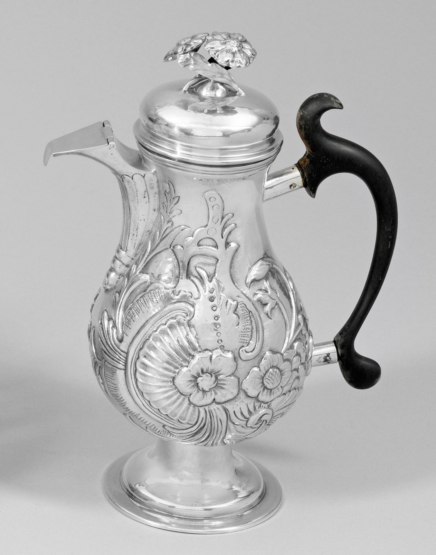 Silber. Birnförmiger Korpus über trompetenförmig aufsteigendem, stark eingezogenem Stand. Haubenartig gewölbter Steckdeckel mit zentralem Knauf in Form von zwei reliefplastischen Blüten. Mittig angesetzter, konischer Konsolausguss von Zungenfries umzogen, mit scharnierter Ausgussabdeckung. Volutierter Ohrenhenkel aus ebonisiertem Holz. Innen vergoldet. Undeutl. gest.; Gew. ca. 655 g. H. 26 cm.