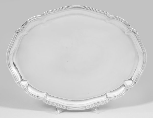 Silber. Ovale Form. Flacher, glatter Spiegel, übergehend in leicht ansteigende Fahne und blütenförmig geschweiften, mehrfach profilierten Rand. Gest., Beschauzeichen, Jahresbuchstabe. Gew. ca. 1085 g. 35,5 cm x 47 cm.