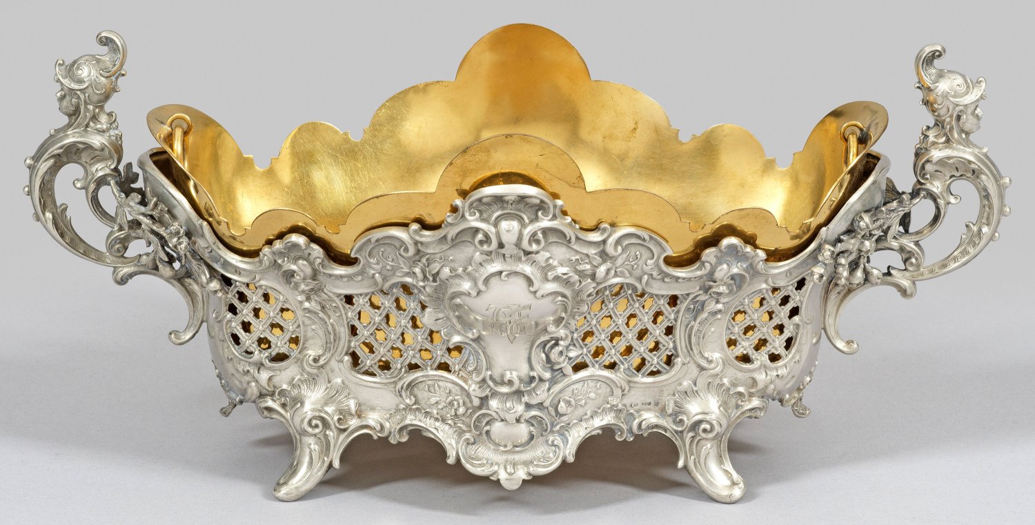 Silber und Messing. Über vier ausgestellten Füßen von Rosenblüten, Rocaillen und C-Schwüngen gerahmter, passig geschweifter Korpus mit netzgitterförmig durchbrochen gearbeiteter Wandung und flächendeckendem Reliefdekor im Rokokostil. Die beiden Schauseiten mit Kartuschen verziert und monogr. "AF". Seitliche Volutenhenkel, bekrönt von plastischen, behelmten Köpfen. Innen vergoldet. Einsatz aus vergoldetem Messing. Gest. 800, Herstellerzeichen. Gew. ohne Einsatz ca. 475 g. H. 15,5 cm. 35 cm x 17 cm.