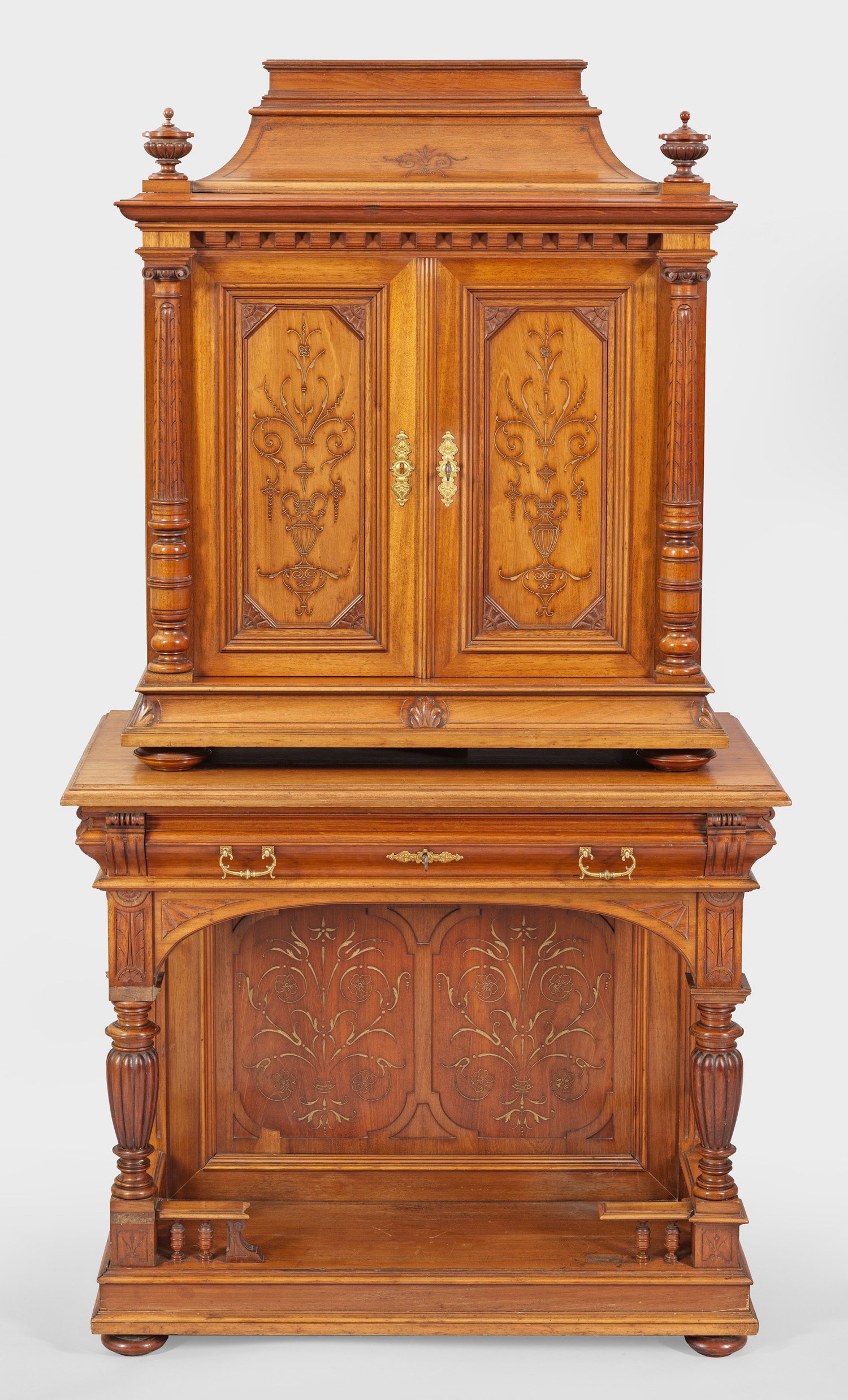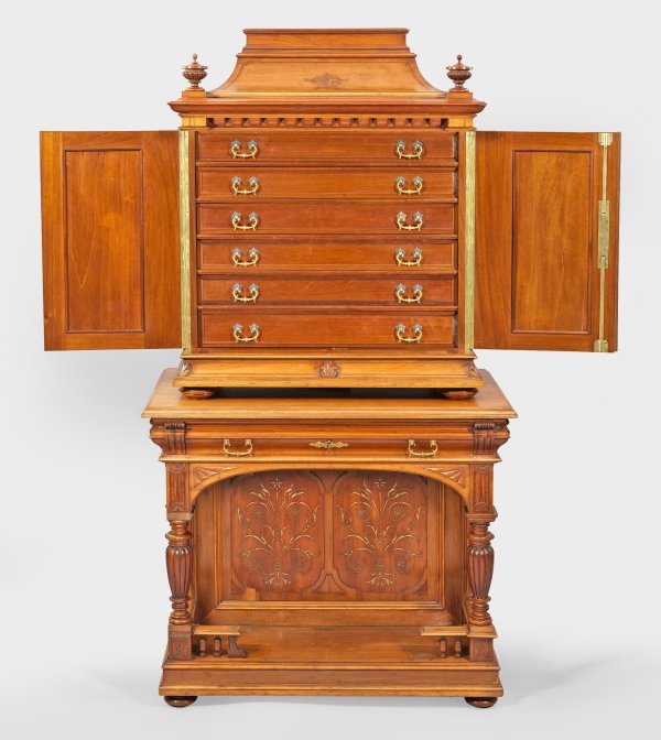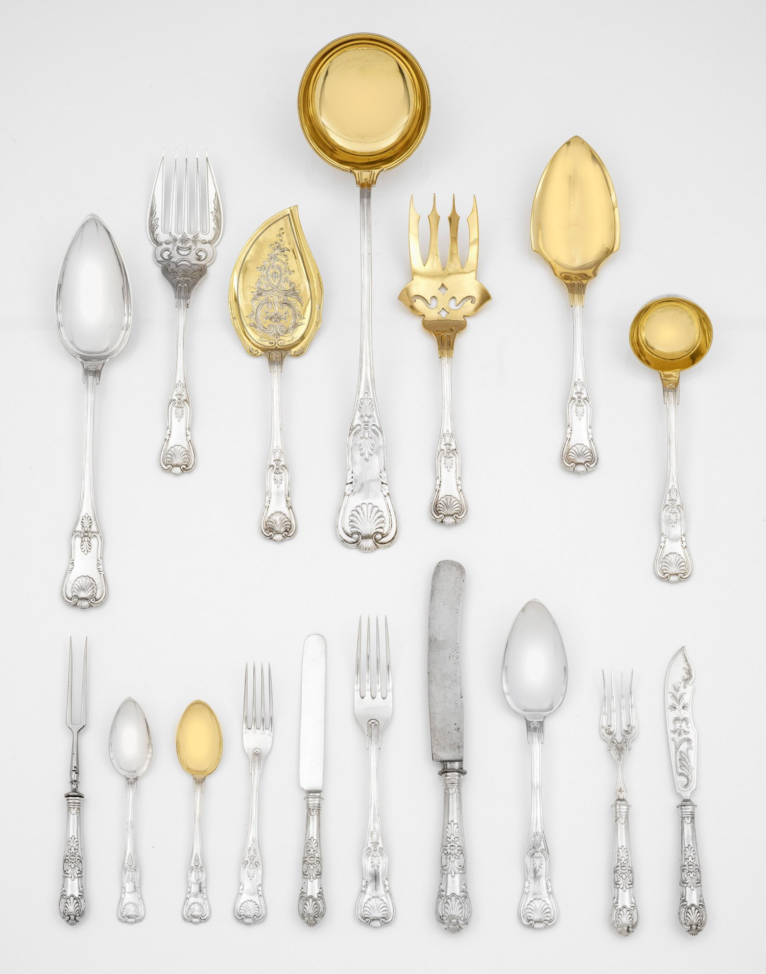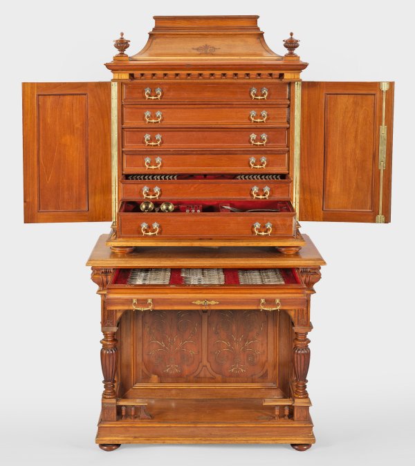 Silber sowie Mahagoni, furniert. 280-tlg.; 48 Speisemesser, 48 -gabeln, 24 -löffel, 24 Fischmesser, 24 -gabeln, 24 Dessertmesser, 24 -gabeln, 24 Eislöffel, 24 Teelöffel, 16 Vorlegeteile u. a. Salatbesteck, Suppenkelle, Fischvorleger, Vorlegelöffel und -gabeln. Randprofilierter, konischer Griff, beidseitig verziert mit Muscheldekor. Schneiden teilw. schauseitig mit feinem Gravurdekor. Der Kabinett-Aufsatzschrank mit profilierter Sockelplatte über stark gedrückten Kugelfüßen. Davon ausgehend zwei konische, godronierte Balustersäulen als Träger für einschübigen Zargenkasten. Hochrechteckiger, zweitüriger Aufsatz mit eingezogenem Gesims, bekrönt von zwei korrespondierend godronierten Balustern. Insgesamt sieben Schubladen mit Facheinteilung für Besteckteile. Im Gesims Silberplakette mit Widmung für "Herrn Waldemar von Dippel". Mit Schlüssel. Besteck-Modell-Nr. 034/1891. Gest. 800, Herstellerzeichen. Gew. zus. ca. 16110 g. (Gew. ohne gefüllte Teile ca. 10470 g.). H. 190 cm. 100 cm x 55 cm.