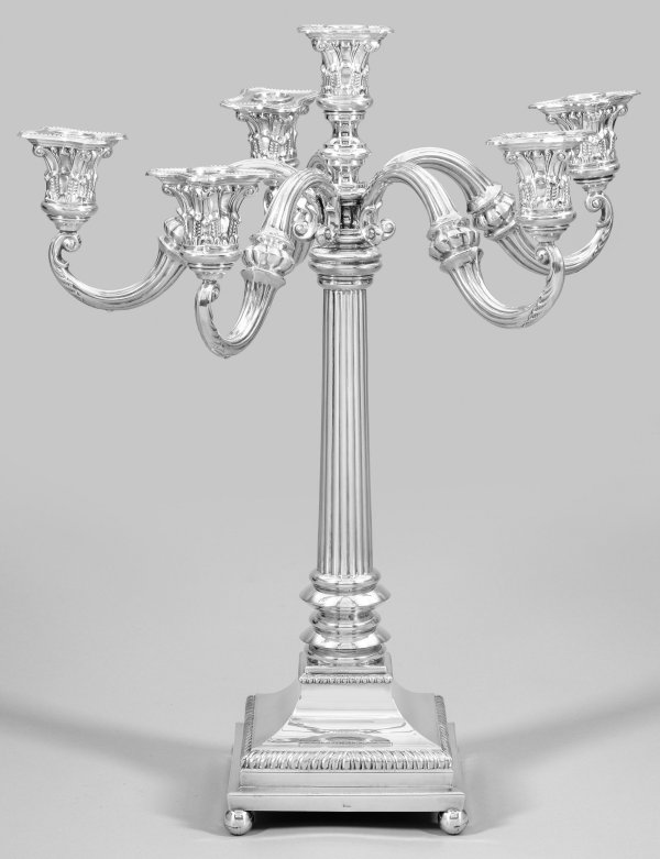 Sterlingsilber. Getreppter, von godroniertem Band umzogener Stand über vier Kugelfüßen, beschwert. Hoher, schmal godronierter Schaft in Form einer korinthischen Säule mit schraubbarem Aufsatz. Davon ausgehend fünf kannelierte, geschwungene Leuchterarme sowie zentral aufsteigender Schaft in reliefiertem Akanthuskapitell als Tülle endend. Eine Tülle lose. Gest. 925, unbekanntes Herstellerzeichen "E". Gew. ca. 6100 g. H. 70,5 cm.