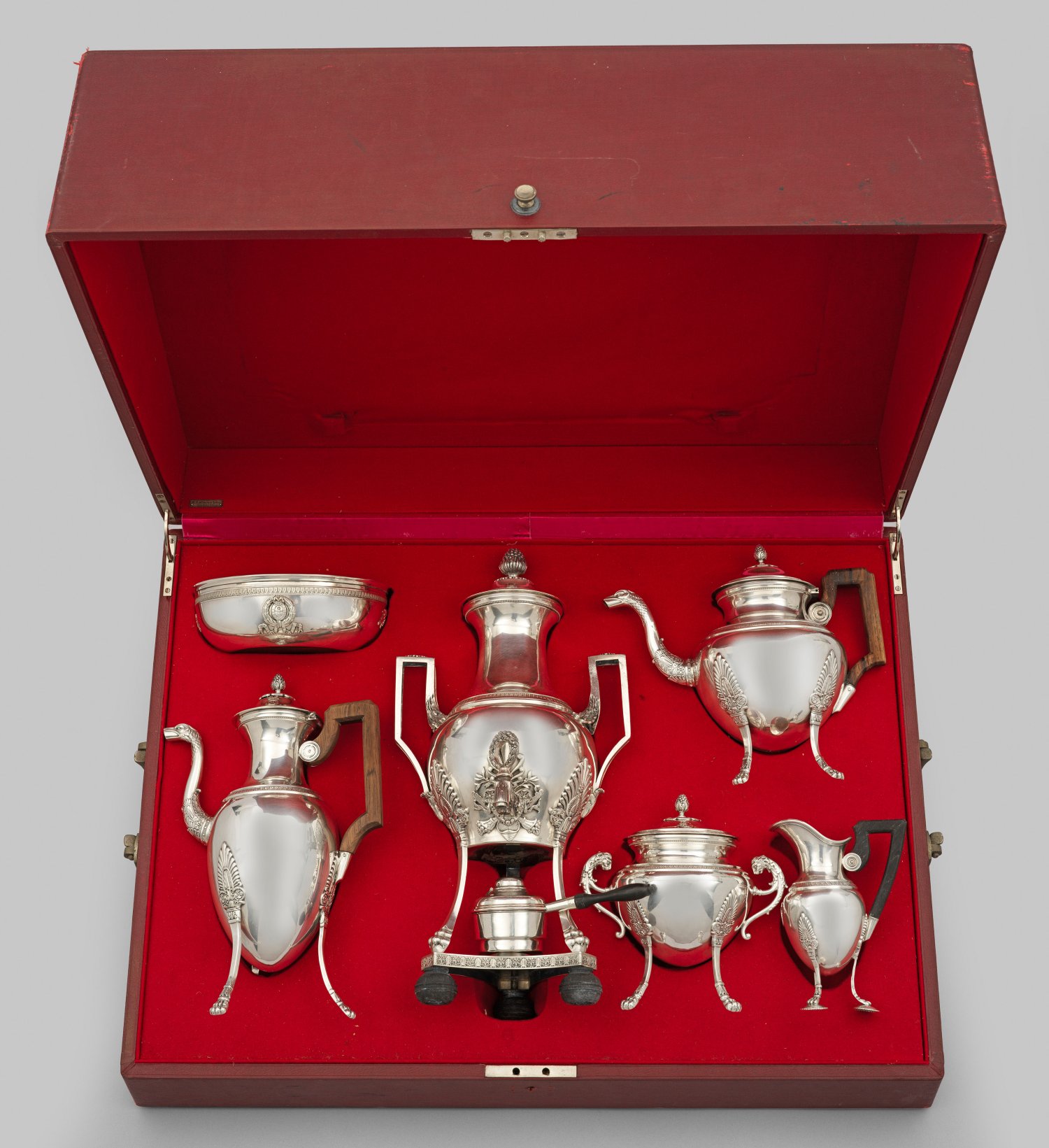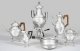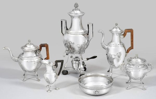 Sterlingsilber. 6-tlg. in Box; Heißwasserkessel mit Brenner, Tee- und Kaffeekanne, Zuckerdose, Sahnegießer und eine Schale. Schmale, stilisierte Tatzenfüße, übergehend in glatten Korpus, verziert mit Palmettenfries. Ausgüsse und Handhaben in Gestalt von plastischen Drachenköpfen bzw. Löwen. Schauseitig sowie auf den Deckeln applizierte, hochovale Medaillons mit dem Familiensignet sowie dem Wahlspruch "Deus Providebit" der Hamburger Familie Michahelles. Gekantete Henkel aus Holz und teilw. innen vergoldet. Gest., franz. Beschauzeichen nach 1838, Exportmarke nach 1878 und Meisterzeichen von Victor Boivin (tätig um 1900). Deutsche Schale erg., gest. 950, Juweliermarke Wilhelm Giese, Hamburg. Gew. zus. ca. 3880 g. H. 6 cm - 41 cm.