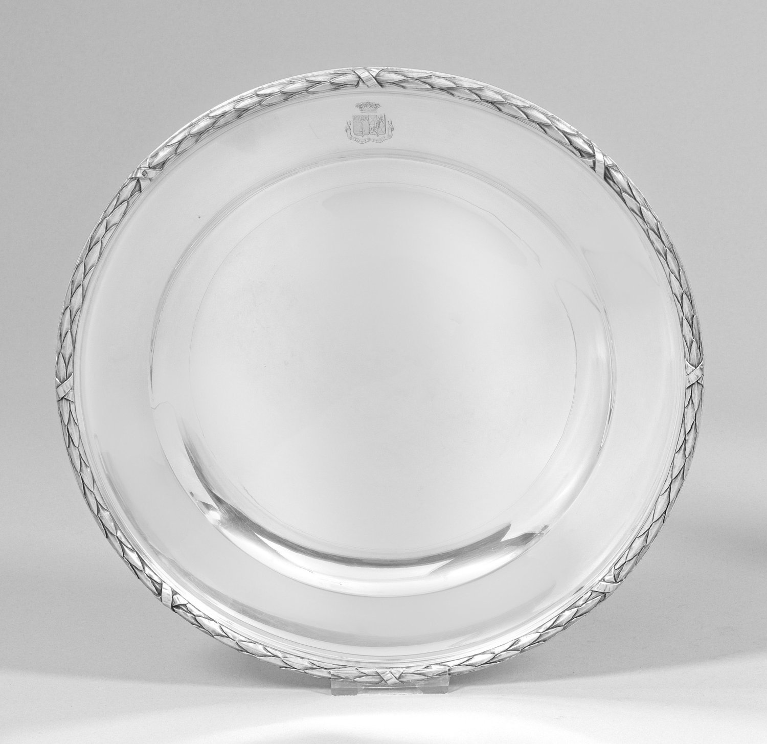 Silber. Runde Form. Eleganter, glatter Spiegel, übergehend in geringfügig ansteigende Fahne. Mehrfach profilierter, erhabener Rand mit reliefplastisch gestalteter, umlaufender Lorbeer- und Kreuzbandbordüre verziert. Auf der glatten Fahne das gravierte, bekrönte Allianzwappen unter franz. Herzogskrone von Napoléon Jean Jules Duc de Montebello (1903-1988) und seiner ersten Frau Marie Adrienne Mathilde d'Albert de Luynes (1898-1929). Die Hochzeit fand 1923 statt. Unterhalb geschweiftes Spruchband mit franz. Devise "Tout Droit". Modell-Nr. 8300. Gest., Beschauzeichen, "Poinçon Bigornes" ab 1838, Herstellerzeichen. Gew. ca. 845 g. D. 29,5 cm.
