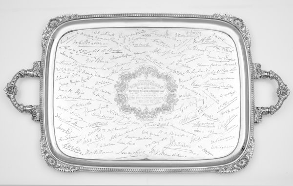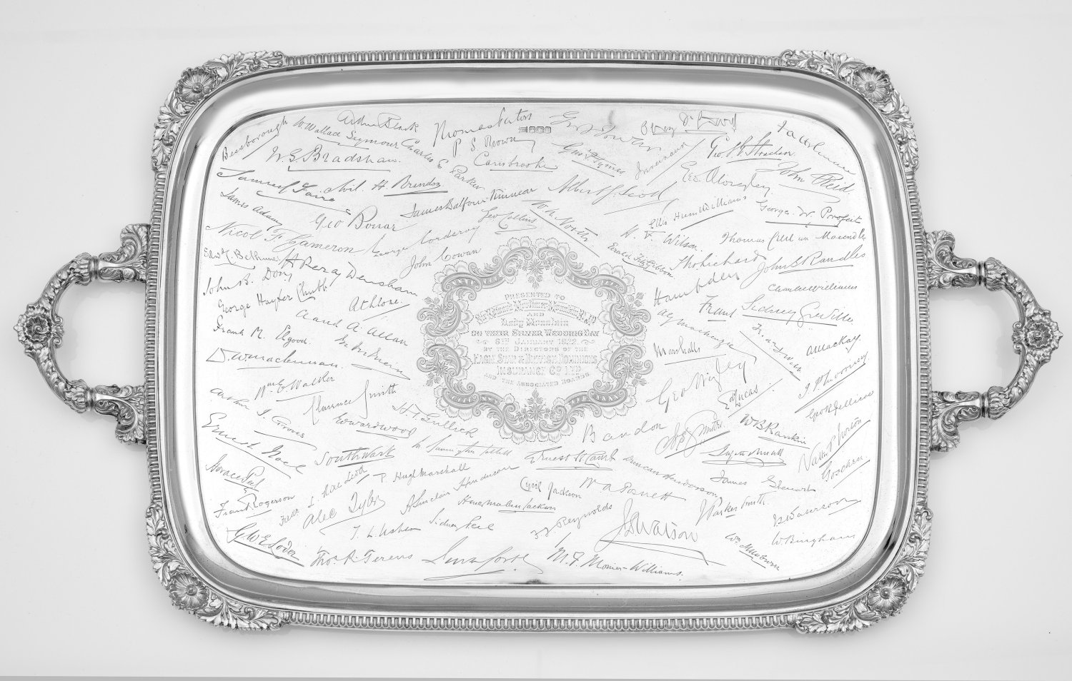 Sterlingsilber. Rechteckige Form mit gerundeten Ecken. Glatter Spiegel mit gering gekehlter Fahne, übergehend in reliefierten, von Godronen und Blüten umzogenen Rand. Gebogte Handhaben mit Rocaillendekor verziert. Im Spiegel eine zentrale, von C-Schwüngen und Blattwerk gerahmte Kartusche mit Widmung "Presented To Sir Edward Mortimer Mountain Br JP And Lady Mountain On Their Silver Weddingday 6th January 1922 By The Directors Of The Eagle Star & British Dominions Insurance Co. Ltd. And The Associated Boards", umgeben von zahlreichen gravierten Unterschriften. Gest., Beschaumarke, Herstellerzeichen, Jahresbuchstabe "C". Gew. ca. 4170 g. 74,5 cm x 43 cm.