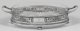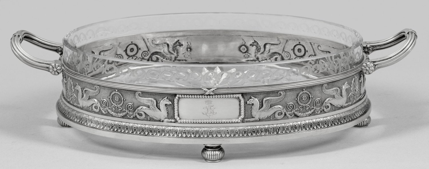 Silber und farbloses Glas. Über vier gedrückten, godronierten Kugelfüßen, ovaler Korpus, umzogen von profiliertem Rand mit Rillen- und Kreuzbanddekor. Die Wandung schau- und rücks. verziert mit rechteckigen, von Perlband umrandeten Kartuschen mit graviertem Monogr. "K J"(?) unter Fürstenkrone sowie dat. "24. VIII 1907". Umlaufender Dekor aus reliefierten Greifendarstellungen, Lorbeerkränzen, Festons und Palmetten über äußerst fein punziertem Grund. Seitliche, gebogte Henkel, am Ansatz mit Blütenrosetten verziert. Glaseinsatz mit geschnittenem Bodenstern, der Rand geschliffen mit stilisiertem Blütenkelchdekor. Wandung im Inneren mit zarter, geritzter Inv.-Nr. "21794". Gest. 84, Beschauzeichen, Herstellerzeichen in Kyrillisch mit Hoflieferantenzeichen. Gew. ohne Glaseinsatz ca. 670 g. H. 7,6 cm. 32 cm x 18,5 cm.