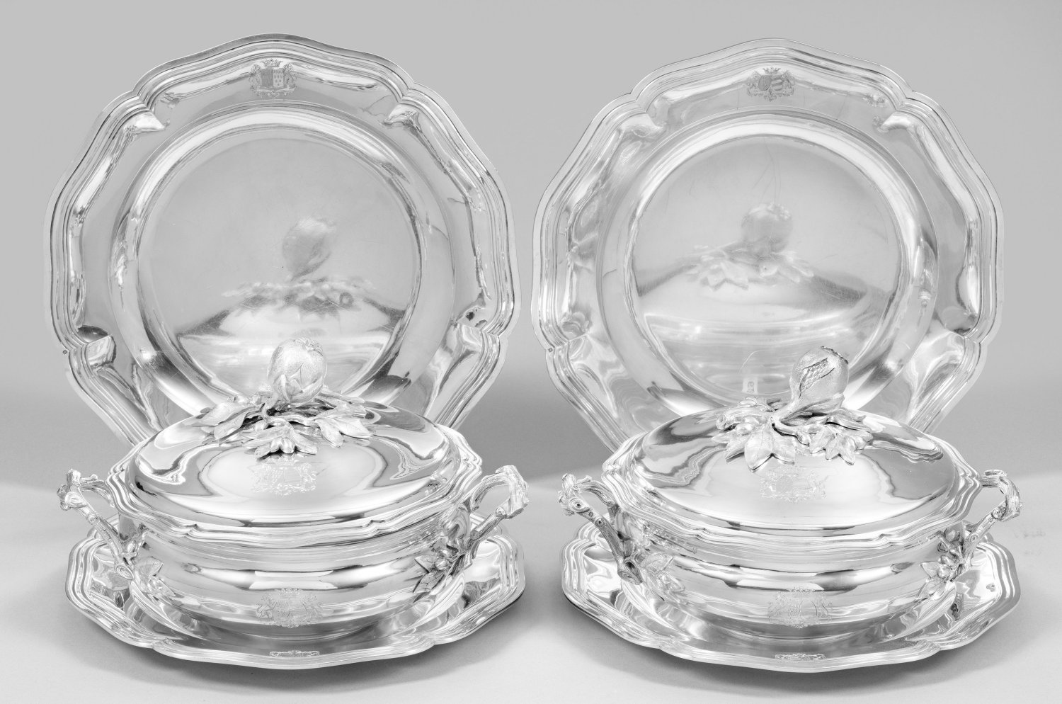Silber. 6-tlg.; Zwei Deckelterrinen, zwei kleine und zwei große Anbietplatten. Über flachem Stand glatter, gebauchter Korpus mit eingezogenem Rand. Blütenförmig geschweifter Deckel, zur Mitte hin aufgewölbt und glatt ansteigend. Als Knauf ein vollplastischer Zweig mit üppigem Blattwerk und Knospen, zentral mit einem prächtigen Granatapfel bekrönt. Seitliche Handhaben korrespondierend in Form von gegenständlichen Zweigen in reliefiertem Blattwerk endend. Im Inneren eine einsetzbare Warmhalteschale. Einsatz, Deckel und Wandung graviert mit einem französischen Allianzwappen unter Marquiskrone, flankiert von zwei steigenden Löwen. Die Teller mit gering vertieftem, glattem Spiegel, übergehend in breite Fahne mit korrespondierender Wappengravur und blütenförmig geschweiftem, mehrfach profiliertem Rand. Gest., Beschauzeichen nach 1838, Meister Alexandre-Auguste Turquet (tätig ab 1855). Gew. zus. ca. 6190 g. Terrinen-H. 16 cm. Platten-D. 27,3 cm - 30 cm.