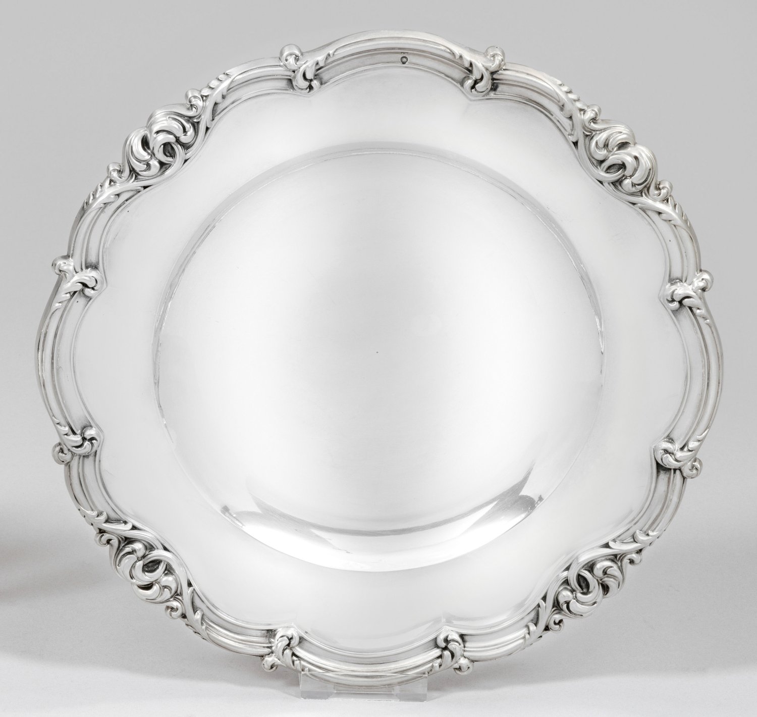 Silber. Gering gemuldeter, glatter Spiegel, übergehend in gering ansteigende, blütenförmig geschweifte Fahne. Mehrfach profilierter Rand umzogen von reliefplastisch volutiertem Akanthusblattwerk. Gest., Beschauzeichen und Garantiemarke (1819 - 1838), Beschauzeichen sowie "Poinçon Bigornes" seit 1838, Herstellerzeichen sowie bez. "ODIOT. A PARIS." . Gew. ca. 835 g. D. 29,5 cm.