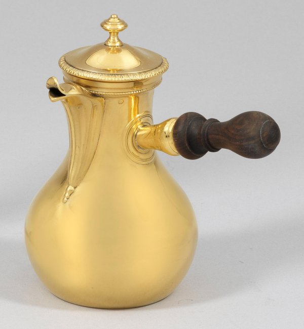 Silber, voll vergoldet. Flacher Stand, übergehend in birnförmigen, glatten Korpus. Scharnierter, gering gewölbter Deckel, umzogen von zartem Blattfries. Zentraler Balusterknauf. Mittig angesetzter Konsolausguss mit Abdeckung. Seitlicher Balustergriff aus Holz. Gest., Beschauzeichen, "poincon bigornes" seit 1838, Pariser Garantiestempel bis 1838, unbekanntes Meisterzeichen. Gew. ca. 305 g. H. 16 cm.