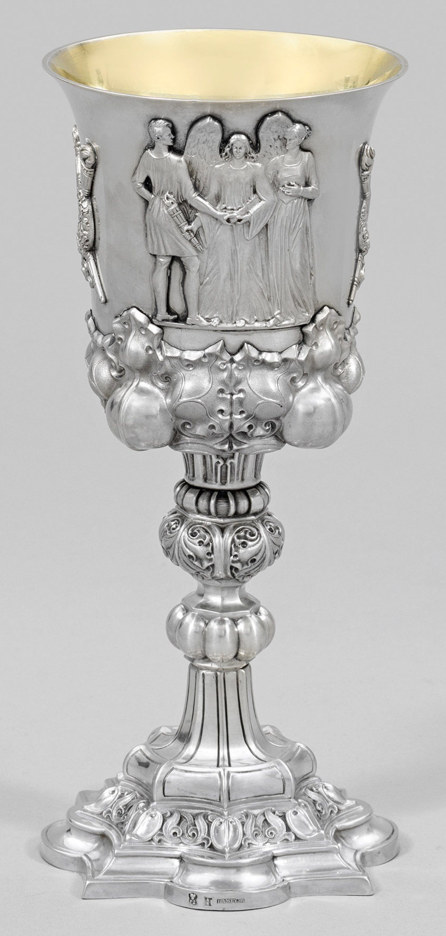 Silber. Achtfach im Wechsel rund bzw. spitz eckig geschweifter, ansteigender Stand, übergehend in kurzen, von mehreren Nodi gegliederten Schaft. Hohe, konisch aufschwingende Kuppa. Stand, Schaft und Kuppaansatz umzogen von reliefplastischem Akanthus- und Weinblattfries sowie ausgeprägtem Buckeldekor. Auf der glatten Kuppawandung rücks. appliziert die allegorische Darstellung der Vermählung zwischen Mann und Frau durch einen Engel, flankiert von gekreuzten Fackeln. Schauseitig ein großer Rosenkranz mit gravierter Inschrift "Heinrich Wilhelm Hahn Minna Clauß Leipzig und Hannover 1821, 30. Mai 1846, Gewidmet von Sophie Johanne Hahn, der Mutter, und den Brüdern Heinrich Bernhard Hahn und Fritz Hahn". Innen vergoldet. Gest. 12 Lot, Beschauzeichen, Ältermannbuchstabe "H", Meister Wilhelm Conrad Josef Lameyer (Meister seit 1837). Gew. ca. 450 g. H. 25 cm.