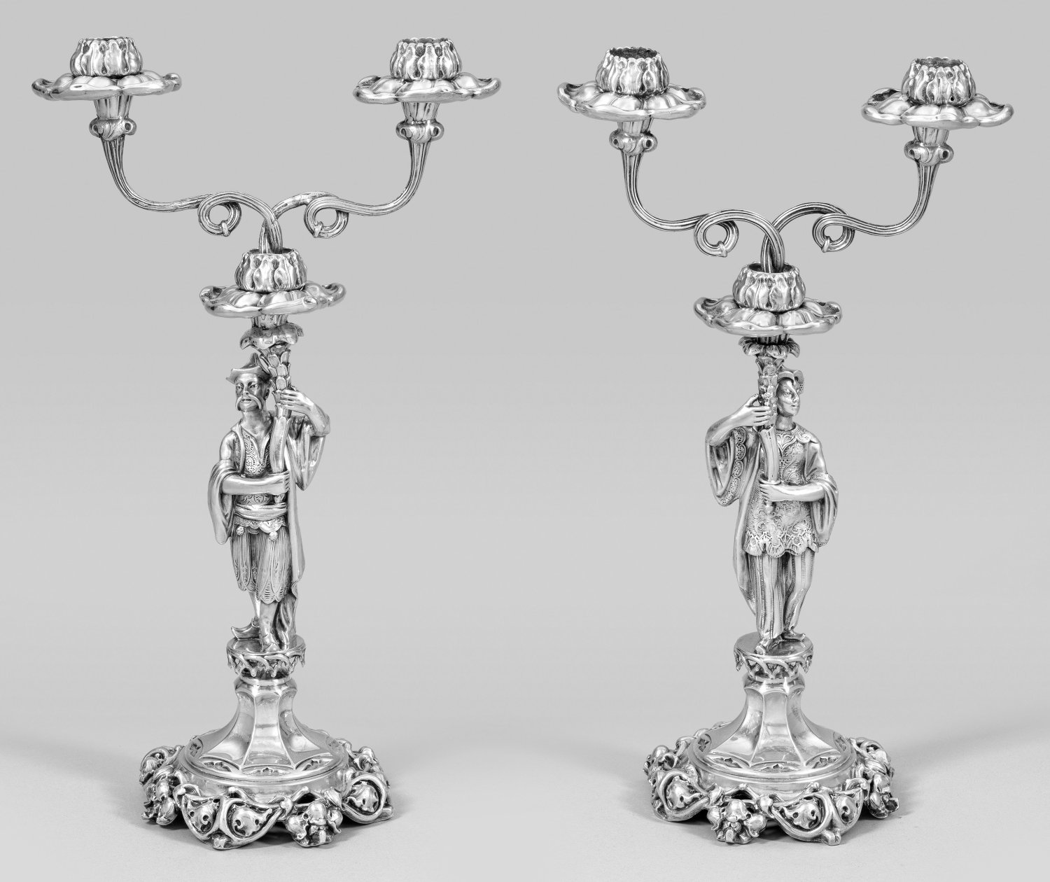 Silber. 2-flg.; Trompetenförmiger, beschwerter Stand, umzogen von durchbrochen gearbeiteten, stark reliefplastischen Blattranken, übergehend in achtfach facettierten Sockel. Darauf die vollplastische Darstellung eines Chinesen bzw. einer Chinesin als Schaft, einen übergroßen Blütenstängel haltend. Davon ausgehend zwei filigrane, hoch aufsteigende Leuchterarme, in blütenförmigen Tüllen endend. Gest., Beschauzeichen, Herstellerzeichen. Gew. zus. ca. 1485 g. H. 35 cm.