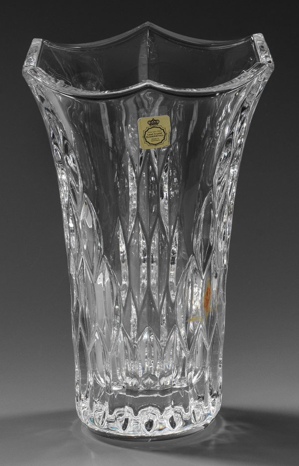Becherform mit sechspassiger Mündung und ornamentalem Keilschliff. Firmenetikett. H. 19,8 cm.