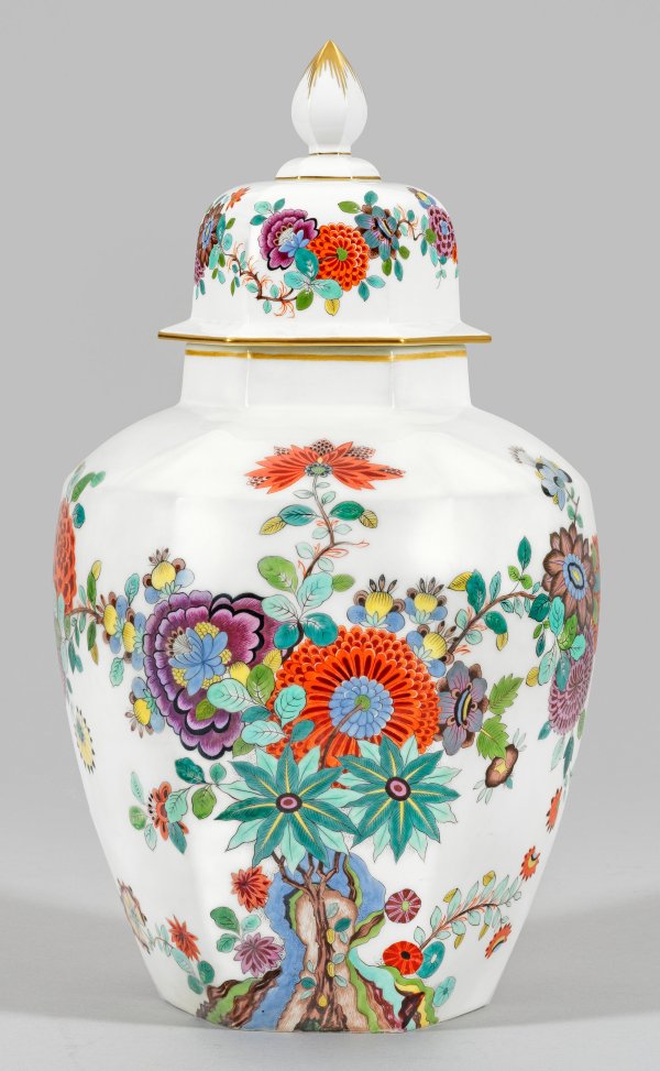 Balusterförmiger, facettierter Korpus mit korrespondierendem, überkragendem Deckel, mittig stilisierter Pinienknauf. Auf der Wandung und dem Deckel großflächiger Kakiemondekor aus blühenden, sich weit verzweigenden Päonien- und Chrysanthemenzweigen, umgeben von farbenprächtigen Schmetterlingen. Polychrome Malerei mit Goldstaffage. Partiell rest.; Schwertermarke. H. 44 cm.