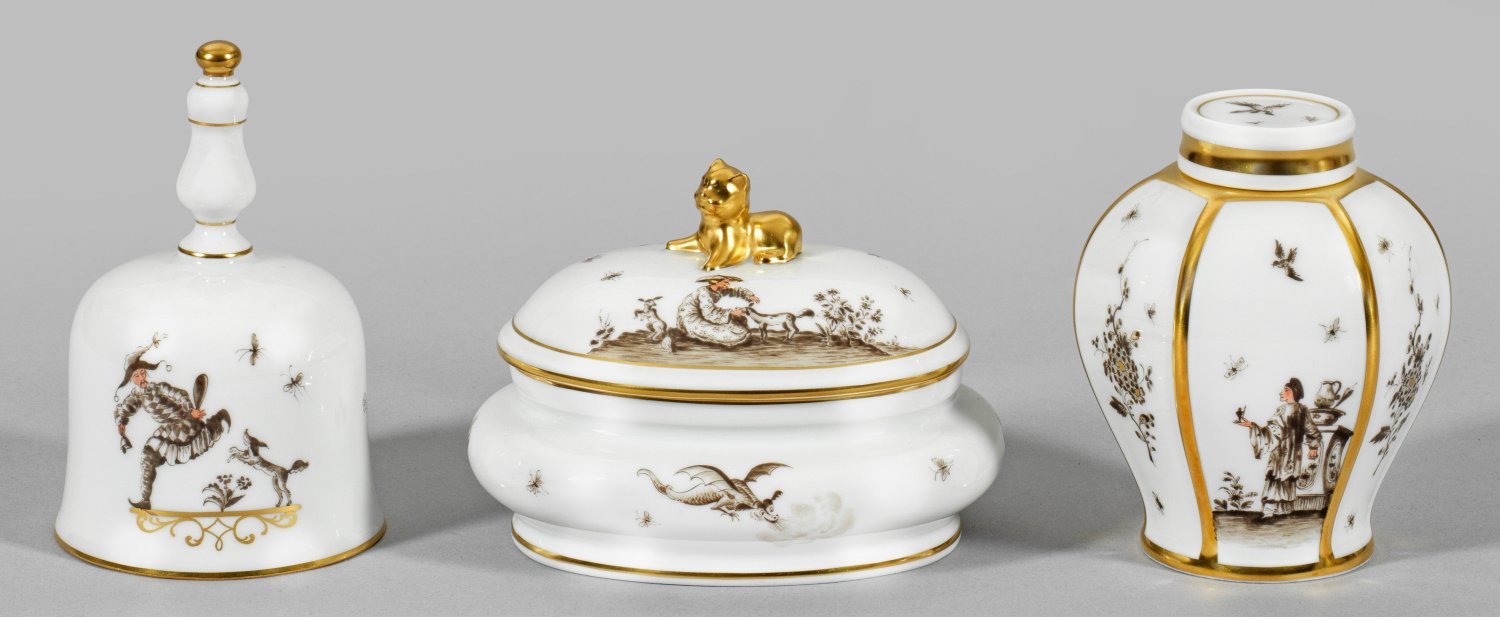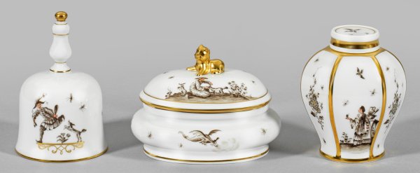 3-tlg.; Tee- und Zierdose, Tischglocke. Zierdosendeckelknauf in Form eines plastisch ausgearbeiteten Fo-Hundes. Auf Wandung und Deckel szenische Darstellung von Chinesen, sog. Chinoiserien nach Johann Gregorius Hoeroldt, anläßlich seines 300. Geburtstags, umgeben von fliegenden Tieren. Feine Sepia- und etwas chamoisfarbene Malerei mit Goldstaffage. Goldsignet. Schwertermarke. H. 9,5 cm - 12,5 cm.