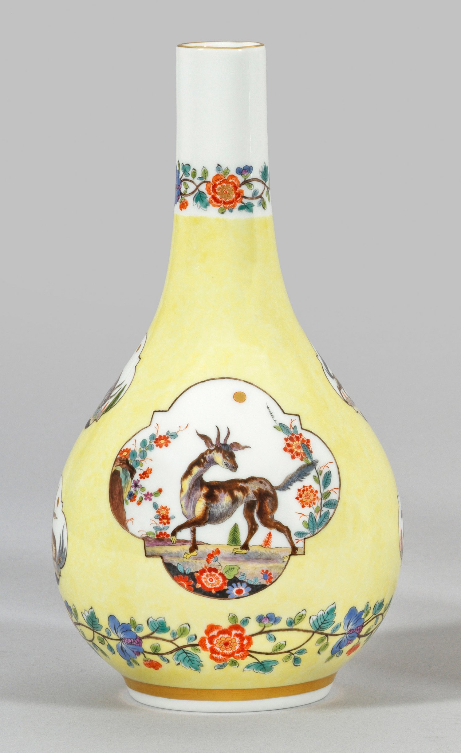 Birnförmiger Korpus mit schmalem, zylindrischen Hals. Überwiegend zitronengelber Fond mit zwei großen und zwei kleinen Vierpasskartuschen mit der Darstellung von verschiedenen Fabeltieren nach Adam Friedrich von Löwenfinck in stilisierter, von Indianischen Blumen geprägter Landschaft. Umlaufend der Wandung zwei Indianische Blütenbordüren. Polychrome Malerei mit Goldstaffage. Schwertermarke. H. 25 cm.