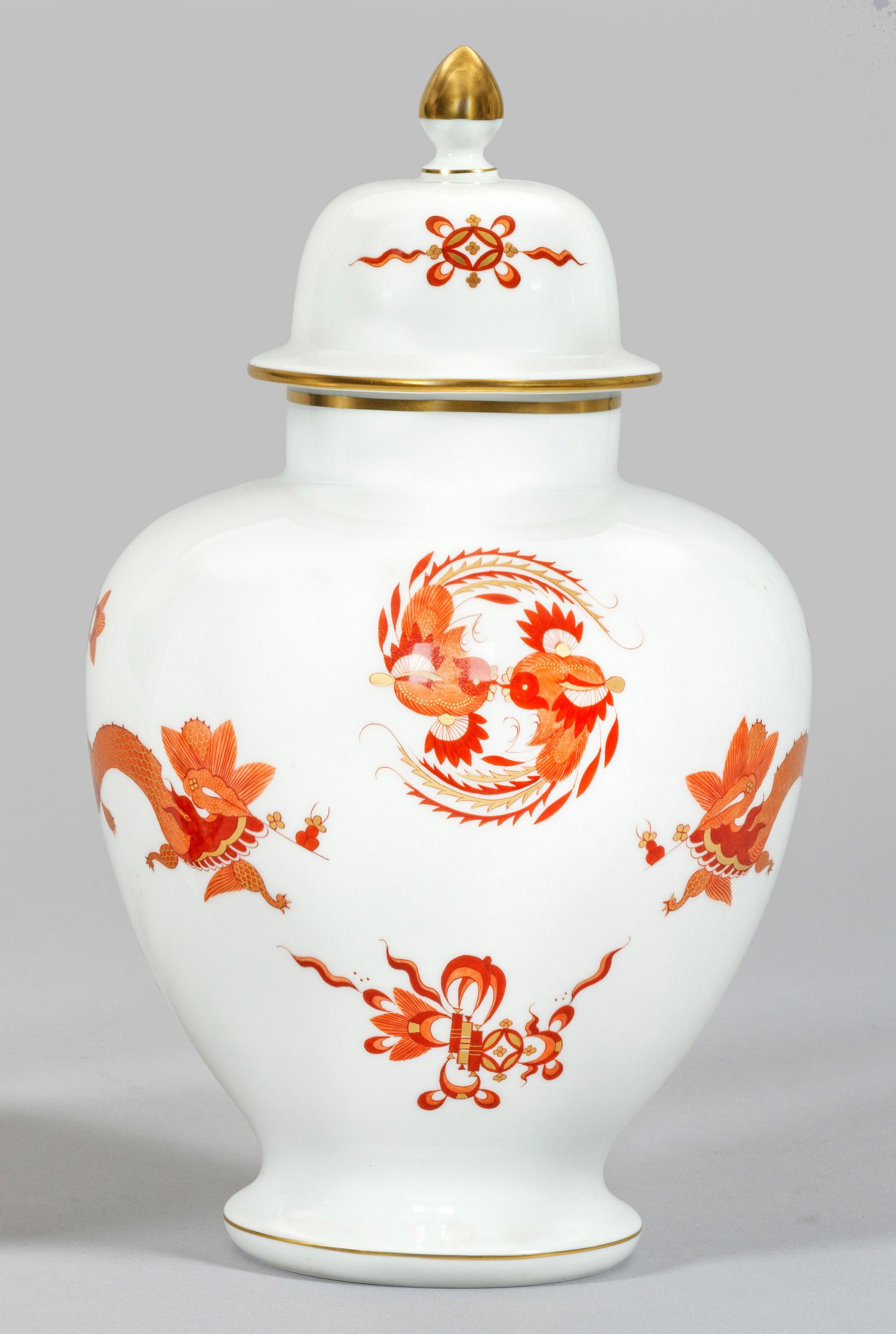Leicht gefußter, balusterförmiger Korpus mit haubenartig aufgewölbtem, überkragendem Deckel, mittig stilisierter Pinienknauf. Auf Wandung und Deckel Dekor "Reicher Drache" in eisenroter, goldschattierter Camaieumalerei. Goldrand. Schwertermarke. H. 33 cm.