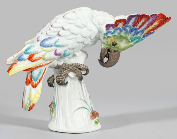 Auf hohem, floral gestaltetem Baumstammsockel hockender Kakadu mit gesenktem Kopf. Äußerst naturalistische, detaillierte Ausführung mit reliefiertem und farbenprächtig akzentuiertem Federkleid und aufgefächerter Federhaube. Polychrome Malerei. Entw. Johann Joachim Kaendler. Modell-Nr. 1780. Rest.; Schwertermarke. H. 32,5 cm.