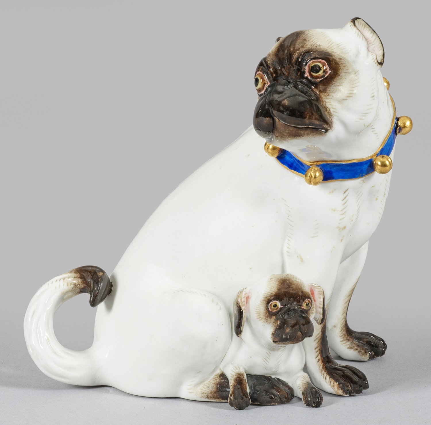 A porcelain figure of a pug dog with puppy wearing a neckband with bells. Insignificantly restored. Crossed swords mark.