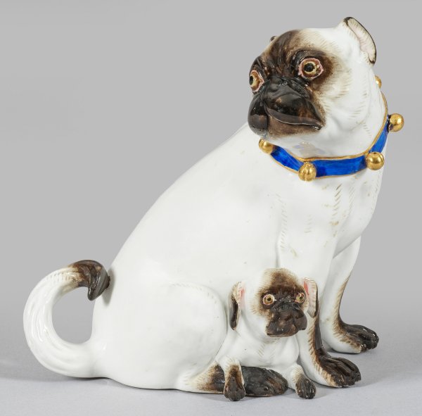 Die vollplastische, nach links gerichtete Darstellung einer sitzenden Mopshündin mit Schellenband, ihr Junges zwischen den Pfoten liegend. Dezente polychrome Malerei mit Glanzgoldstaffage. Entw. Johann Joachim Kaendler, um 1741. Modell-Nr. 315. Schwertermarke; unw. rest.; H. 18,5 cm.