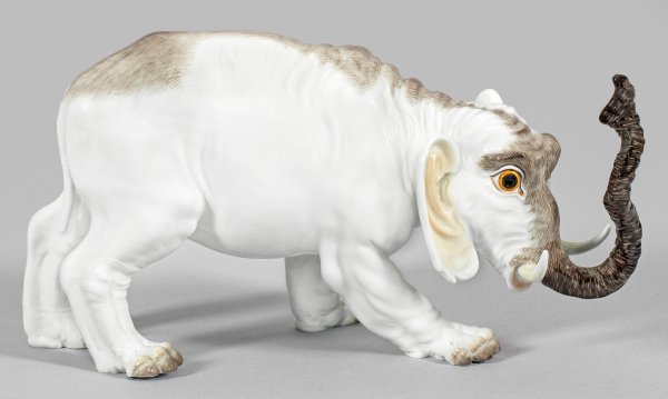 Nach rechts stehender Elefant mit erhobenem Rüssel. Naturalistisch hellgrau staffiert. Sparsame polychrome Malerei. Entw. Johann Joachim Kaendler und Peter Reinecke. Modell-Nr. 78956. Limitierte Auflage. 010/100. Beiliegend Zertifikat. Jahreszeichen. Schwertermarke mit Goldsignet. H. 12 cm. 25 cm x 9 cm.