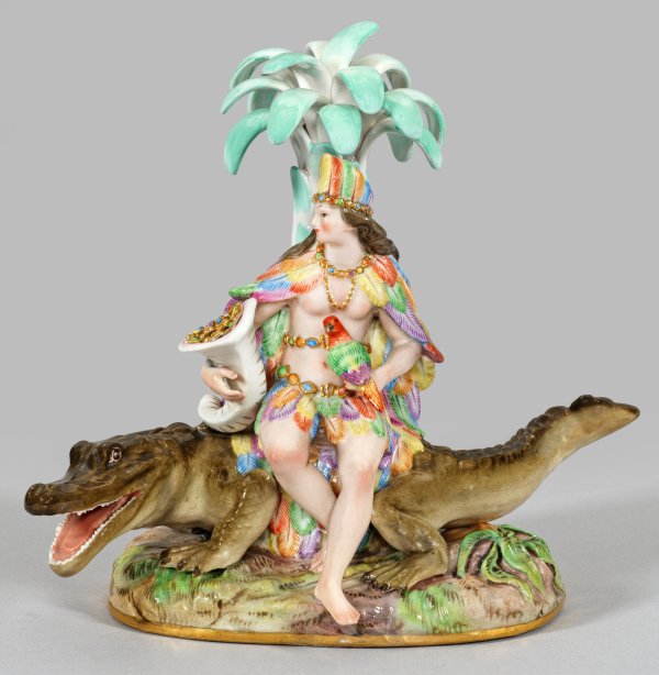 aus der Serie "Vier Erdteile". Naturalistisch gestalteter Sockel. Auf einem Krokodil sitzende Indianerin mit langem Federumhang und Lendenschurz sowie reichem Federschmuck, den Kontinent Amerika personifizierend. In der rechten Hand ein mit Juwelen gefülltes Horn tragend. Polychrome Malerei mit Goldstaffage. Entw. Johann Joachim Kaendler. Modell-Nr. 757. Unw. rest.; Schwertermarke. H. 18 cm.