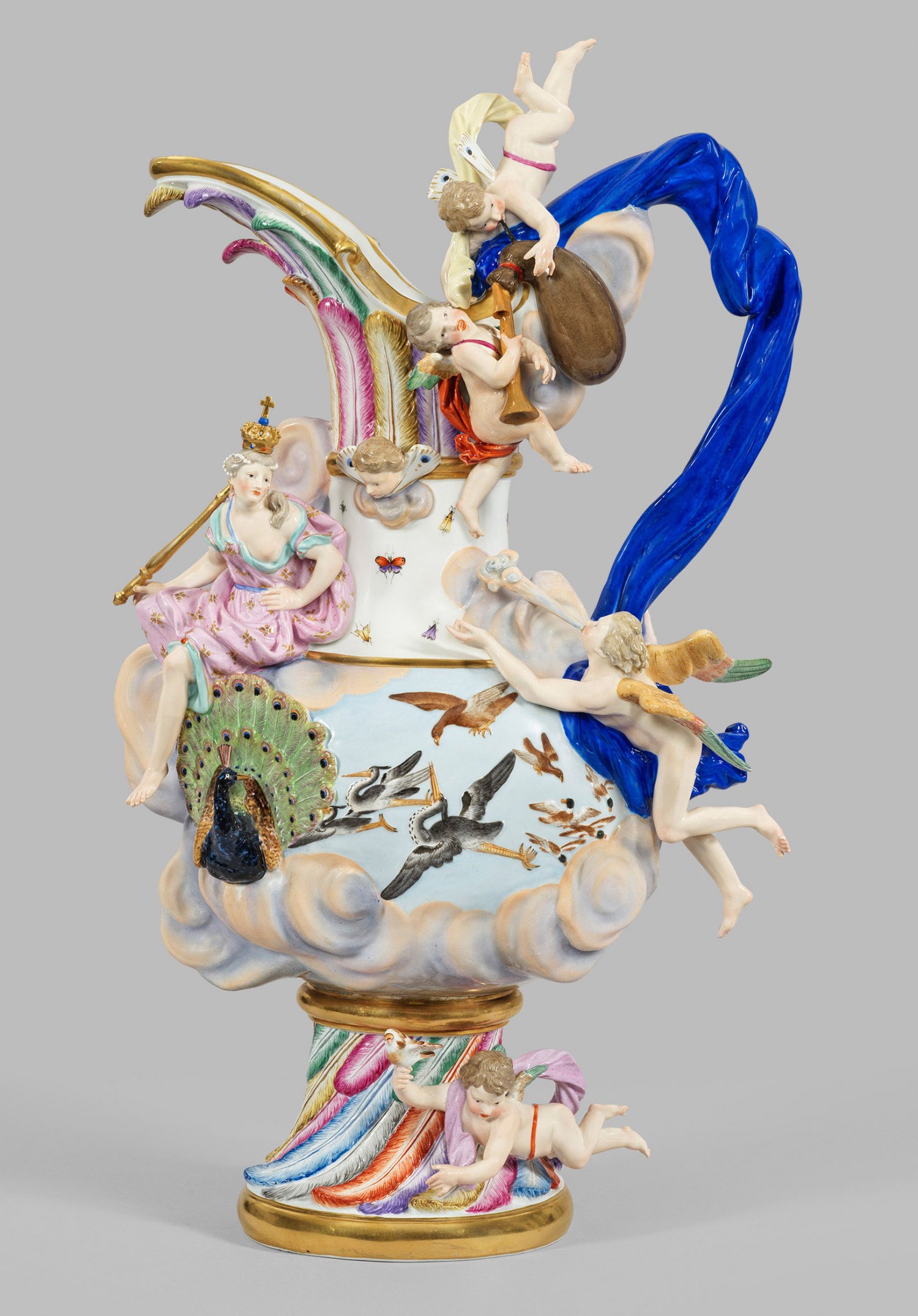 A monumental jug-shaped porcelain vase representing the element "Air". Rich applied and painted decoration with goddess Juno with peacock as her symbol, cupids with bagpipe and trumpet, butterflies and birds among clouds. Restored. Crossed swords mark.