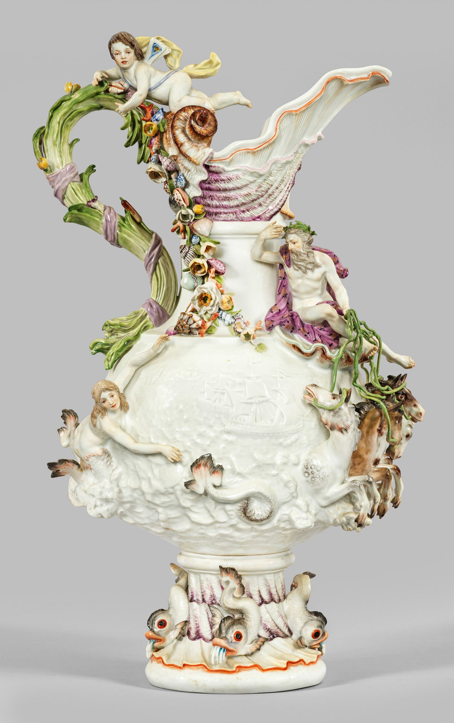 In Form einer Schenkkanne. Aus der Serie "Vier Elemente". Über ovalem Fuß bauchiger Korpus mit abgesetztem, eingezogenem Hals mit Wulst, in muschelförmig reliefierten Ausguss übergehend. Daneben reliefplastische Blüten- und Muschelgirlande. Seitlich geschweifter, in gebündelten Schilfblättern gestalteter Henkel mit bekrönendem Amor. Stark reliefplastischer, teilw. vollplastisch modellierter Dekor aus naturalistischen und mythologischen Elementen der Meereswelt als Symbol des Elements Wassers. Auf dem Fuß große schwimmende Delphine, die reliefierte Wandung mit einer aus dem Meer auftauchenden Nereide. Auf der Gefäßschulter der in einer Muschel sitzende Meeresgott Neptun, mit vegetabilen Zügeln vier Hippokampen steuernd. Umlaufend gewellte Meeresoberfläche mit schauseitiger Darstellung einer Kriegsflotte. Sparsame polychrome Malerei. Entw. Johann Joachim Kaendler, 1741. Modell-Nr. 320. Rest./best.; Schwertermarke. H. 66 cm.