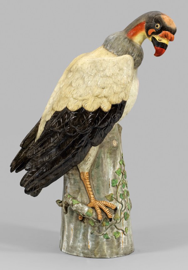 Auf hohem, mit plastischen Efeuranken belegtem Baumstumpf sitzender Königsgeier mit angelegten Flügeln und nach unten geneigtem und nach rechts gewandtem Kopf in statuarischer Haltung. Annähernd lebensgroße, naturnahe Ausführung mit fein reliefiertem, schwarz-weißem Federkleid, orangerot bis gelb staffiertem, nacktem Hals mit Kropf, Schnabel sowie typischer Schnabelwarze. Polychrome Malerei mit etwas Gold. Entw. Johann Joachim Kaendler, um 1731-1734. Modell-Nr. 1768. Unw. rest.; Schwertermarke. Meissen. 2. Hälfte 19. Jh.; H. 68 cm.