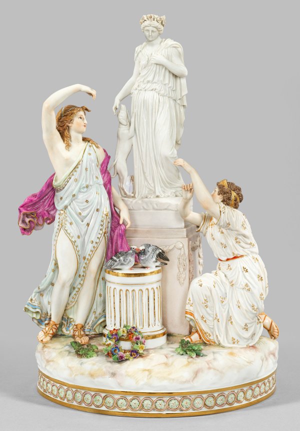Runder, von reliefiertem Flechtband umzogener Felssockel mit allansichtiger Figurengruppe. Mittig auf einem mit Festonen geschmückten Podest stehende, weiß belassene Skulptur der blumenbekränzten Artemis (Diana), Göttin der Jagd, mit Jagdhund. Flankierend zwei die Göttin huldigende junge Frauen. Rechts eine aufblickende, kniende junge Dame in geblümtem Kleid sowie links eine weitere, antik gewandete Begleiterin an einem Säulenfragment stehend, auf dem ein Turteltaubenpaar sitzt. Am Boden plastischer Rosenkranz. Rücks. stehendes Mädchen. Zu ihren Füßen liegender Korb mit plastischen Blüten. Polychrome Malerei mit reicher Goldstaffage. Entw. Johann Daniel Schöne, 1796. Modell-Nr. L 9. Minim. best./minim. rest.; Schwertermarke. H. 35 cm.