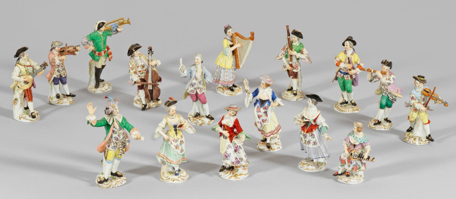 16-tlg.; Auf rocaillereliefiertem Sockel stehende bzw. sitzende Musikanten und Sänger in höfischer Rokoko-Kleidung. Dirigent, Flötist, fünf Sängerinnen, Lautenspieler, zwei Geiger, Trompeter, Harfenspielerin, Leierspielerin, Klarinettist, Cellist und Fagottist. Polychrome Malerei mit Goldstaffage. Entw. Friedrich Elias Meyer und Johann Joachim Kaendler, um 1754/55. Teilw. unw. rest./best.; Schwertermarke. H. 11 cm - 15,5 cm.