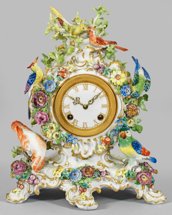 Von stark reliefplastischen Rocaillen getragener, naturalistisch gestalteter Felssockel, umzogen von filigran modellierten, plastisch aufgelegten Blumenranken, in korrespondierendes Uhrengehäuse übergehend. Seitlich des Sockels Kakadu und Papagei sitzend. Das Gehäuse eingerahmt von aufsteigenden Ästen mit vollplastisch gearbeiteten Vögeln, bekrönt von einem Nest mit Jungvögeln. Polychrome Malerei mit Goldstaffage. Entw. Johann Joachim Kaendler. Rundes, von Blüten und Muschelrocaillen gerahmtes Zifferblatt mit arabischen Zahlen. Messingwerk mit Halbstundenschlag auf Glocke. Modell-Nr. 60817. Schwertermarke. Jahreszeichen. H. 33 cm. 27 cm x 14 cm.