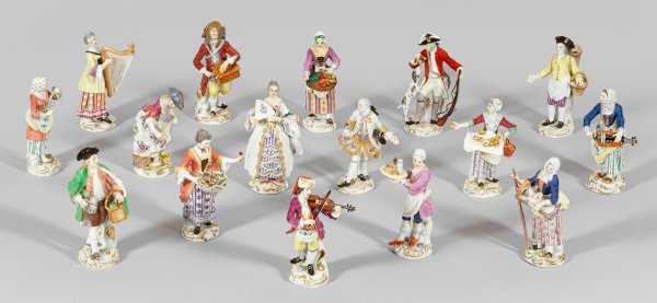 sog. Pariser Ausrufer. 15-tlg.; teilw. mit plastischen Blüten und Blättern belegte Rocaillesockel. Darauf Austernhändler, Blumenhändlerin, Gemüsehändlerin, Obsthändlerin, Limonadenverkäufer, Dame mit Fächer, Mädchen mit Triangel, Ausrufer mit Leierkasten, Ausrufer mit Laterne, Edelmann, Mädchen mit Drehleier, Mutter mit Wiege, Mädchen mit Küken, Jäger und Geiger. Polychrome Malerei mit Goldstaffage. Entw. Johann Joachim Kaendler. Edelmann minim. rest.; Schwertermarke. H. bis 15 cm.