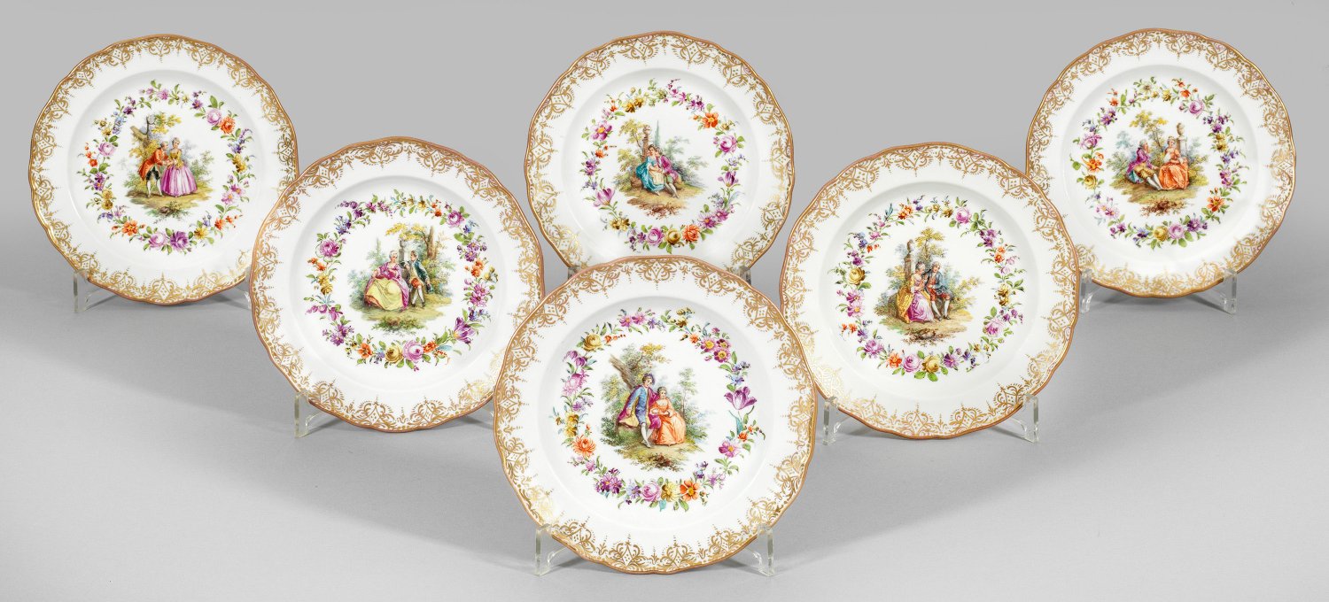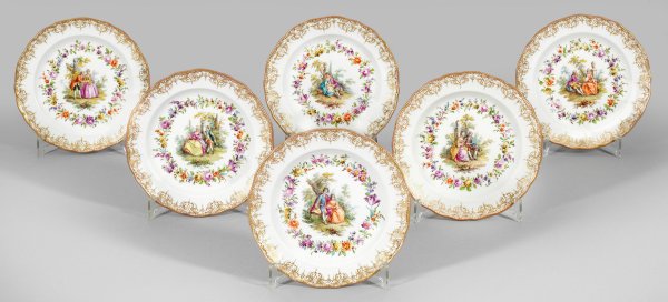 Six porcelain plates with figural gallant scenes. Gold rubbed. Crossed swords mark.