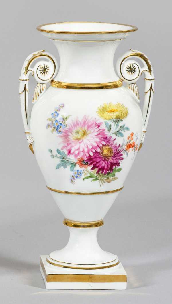 Hochgezogener Rundfuß mit Nodus auf quadratischer Plinthe. Ovoider Korpus, an gerundeter Schulter beidseitig stilisierte Rosettenhenkel. Beidseitig große Blumengebinde aus unterschiedlichen Blüten. Polychrome Malerei. Minim. best.; Goldstaffierung. Schwertermarke. H. 30 cm.