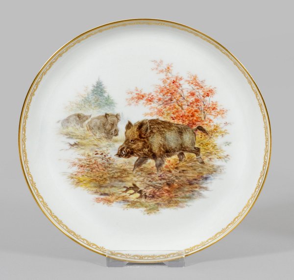 Runde, leicht gemuldete Form mit ornamentaler Goldkontur. Im Spiegel die waldbestandene Darstellung von drei Keilern. Nach Vorlage von J. E. Ridinger. Feine polychrome Malerei. Schwertermarke. D. 17,5 cm.