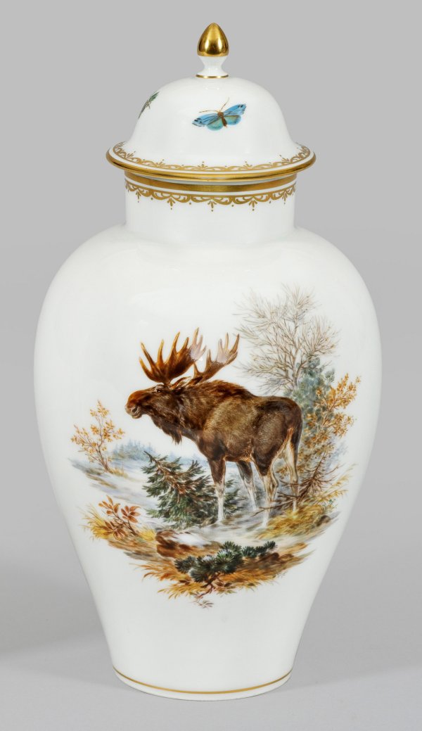 Gestreckte Eiform mit kurzem, zylindrischem Hals und passigem, glockenartigem Deckel. Schauseitig der Wandung baumbestandene Darstellung eines Elchs. Verso Beerenzweig. Polychrome Malerei mit ornamentaler Goldkontur. Nach Vorlage von J. E. Ridinger. Geschenk der Kollegen zum 25-jährigen Arbeitsjubiläum 1976, in Gold bez.; Schwertermarke. H. 25 cm.