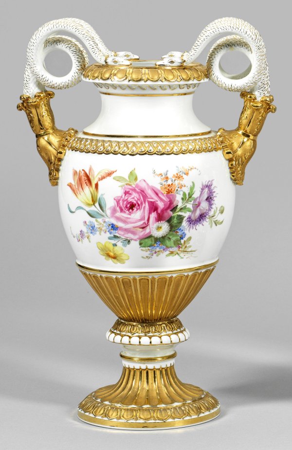Auf rundem Fuß amphorenförmiger Korpus, umzogen von vergoldeten, reliefierten Ornamentbordüren. Seitlich aus plastischem Akanthusblattansatz aufsteigende Henkel in Gestalt von spiralförmig eingerollten Schlangenpaaren. Beidseitig der Wandung Blumenarrangements in polychromer Malerei. Goldbronze. Entw. Ernst August Leuteritz. Modell-Nr. E116. Schwertermarke. H. 39 cm.