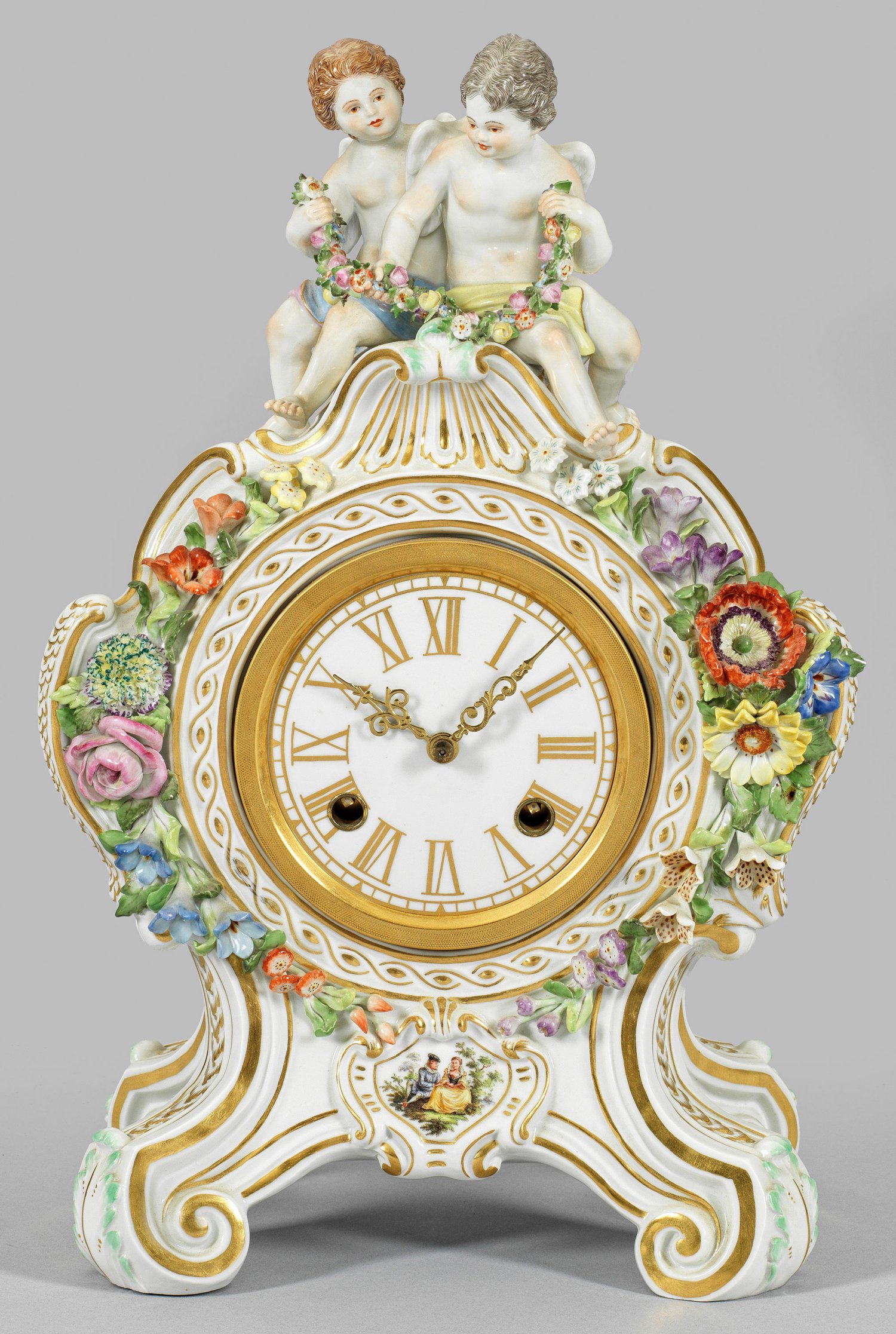 Über vier eingerollten Voluten balusterförmig aufsteigender Uhrenkorpus, bekrönt von vollplastischem Amorettenpaar mit Rosengirlande. Umlaufender Dekor aus Streublumen und Blumengebinden. Schauseitig kartuschenartig gerahmtes und von plastisch aufgelegten Blütenranken umzogenes Emailzifferblatt mit arabischen Zahlen. Halbstundenschlag auf Glocke. Entw. Ernst August Leuteritz. Modell-Nr. 60811. Schwertermarke. H. 34 cm. 22 cm x 14 cm.