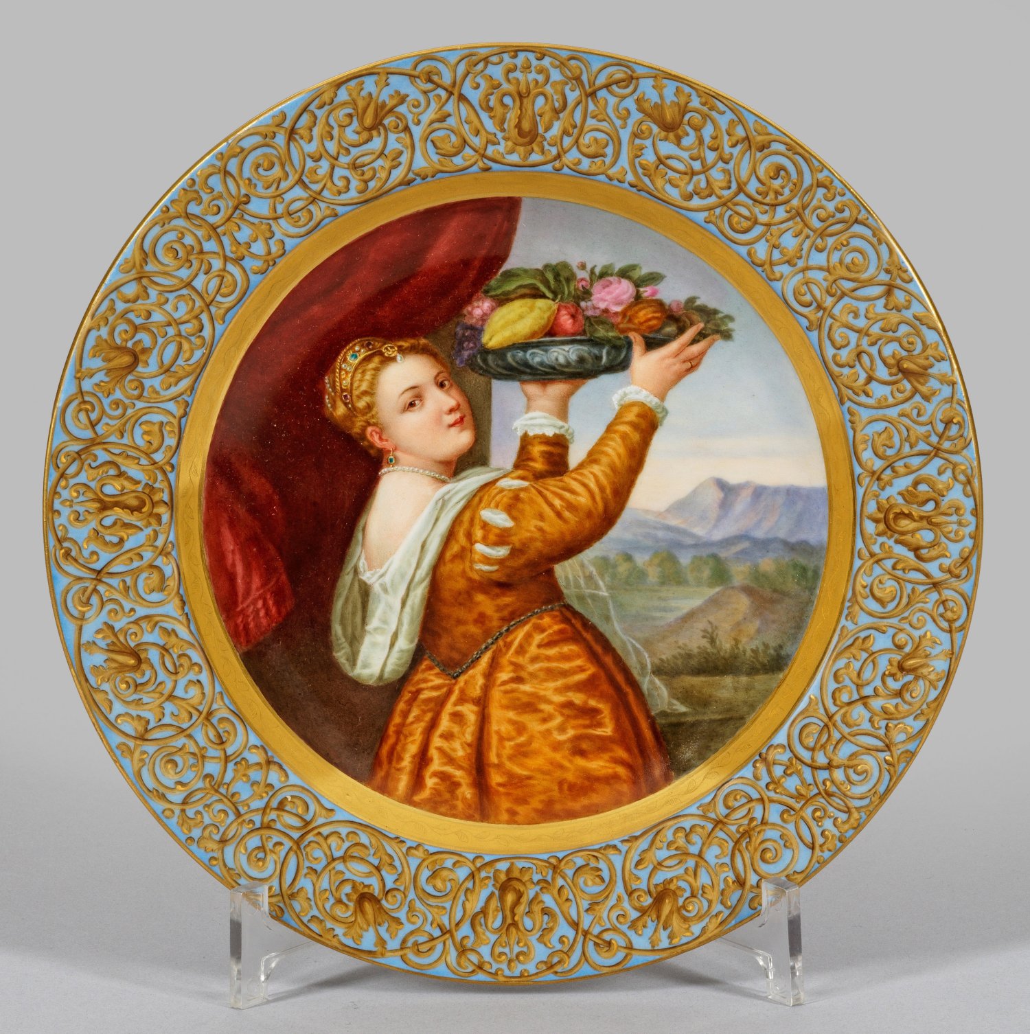 Runde, leicht gemuldete Form. Die Fahne mit äußerst fein gemalter Ornamentbordüre. Die Kehlung mit goldradiertem Floralband. Im Spiegel die Darstellung der Halbfigur einer jungen Dame, den Kopf rückwärtig zum Betrachter geneigt, edlen Schmuck tragend und vor einem Vorhang eine Silberschale mit Früchten hochhaltend. Weitläufiges Bergpanorama im Fond. Feine polychrome Malerei mit Goldstaffage. Nach einem um 1555 entstandenen Gemälde von Tizian (um 1488/1490-1576), italienischer Maler der Renaissance. D. 24 cm.
