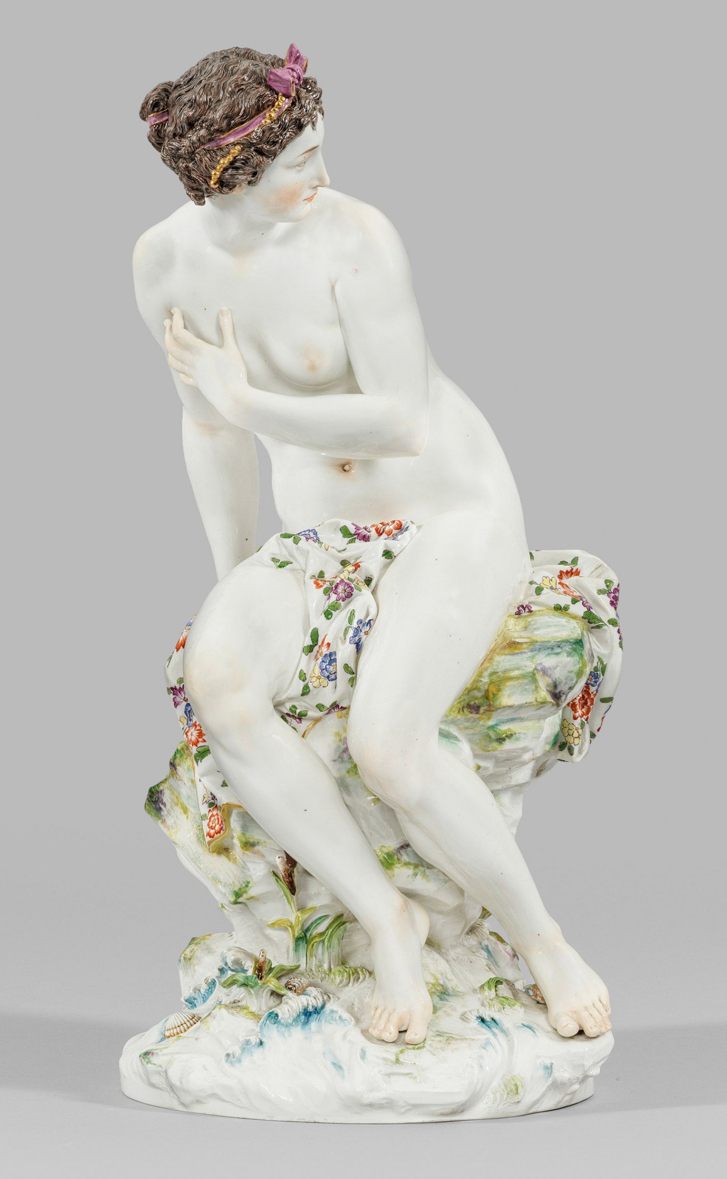 Runder, naturalistisch gestalteter Sockel mit reliefierten Wellen, aufgelegten Schilfpflanzen und Muscheln. Am Ufer, auf einem hohen, farnbewachsenen Fels sitzender, weiblicher Akt mit die Scham bedeckendem, von Kakiemonblüten gemustertem Tuch, den Kopf in starker Drehung nach links gewandt. Der rechte Arm ausgestreckt während sie mit dem Linken ihre Brust bedeckt. Polychrome Malerei mit Goldkonturierung. Entw. Emmerich Andresen, um 1889. Modell-Nr. O 142. Unw. rest.; Schwertermarke. Meissen. Ende 19. Jh. H. 50 cm.