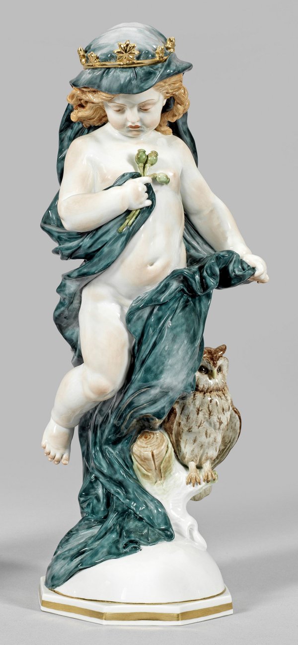 Auf oktogonalem, halbkugelig aufgewölbtem Sockel stehende, weibliche Amorette mit dunkelblauem Umhang und Sternenkrone. Zu ihren Füßen eine, auf einem Baumstamm hockende Eule als Allegorie der Nacht. Polychrome Malerei mit Goldstaffage. Entw. Heinrich Schwabe, 1877 - 1880. Modell-Nr. 70705. Jahreszeichen. Schwertermarke. H. 35 cm.