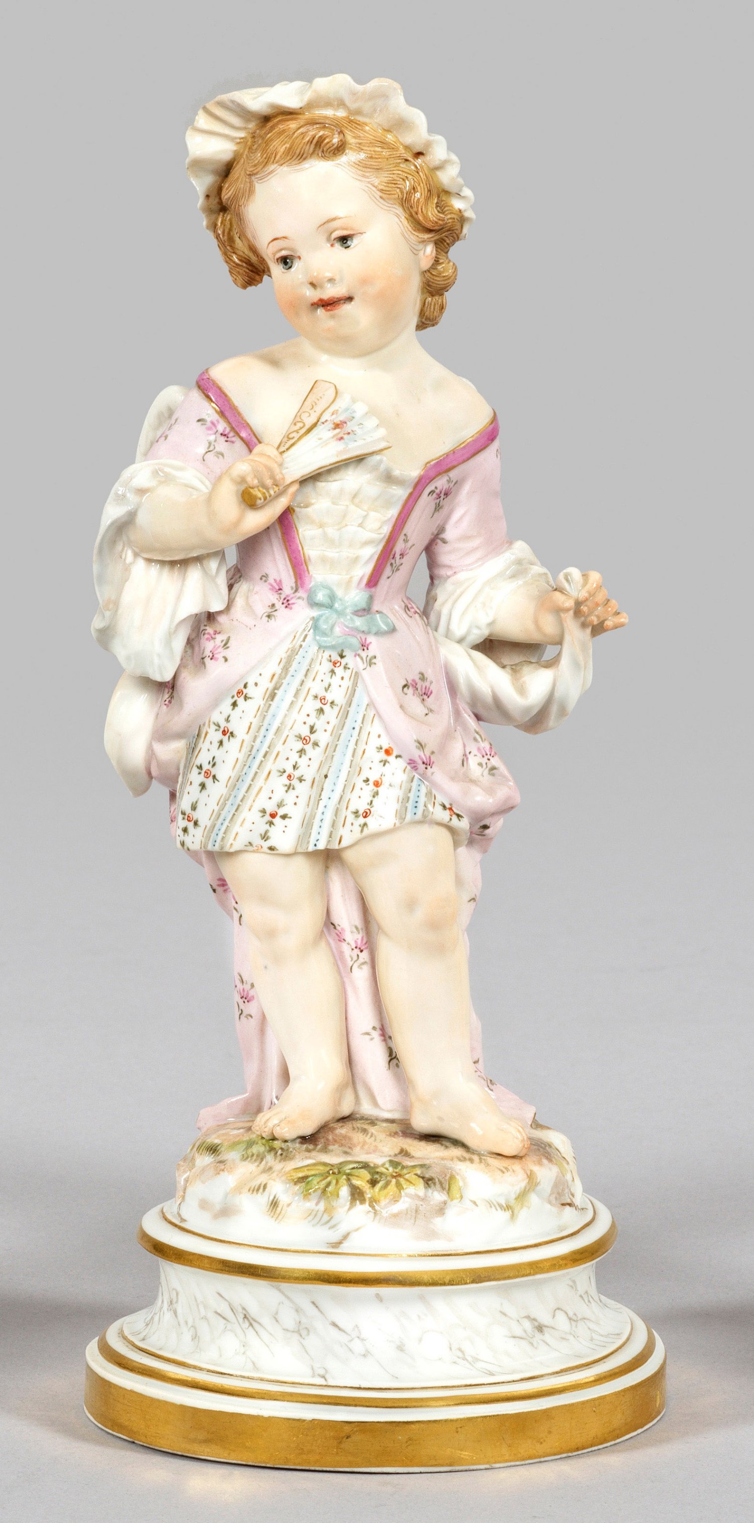 Auf profiliertem, marmoriertem Rundsockel, über naturalistisch gestaltetem Terrain stehende, kokett posierende Amorette in blumig gemustertem, höfischem Kleid über gestreiftem Unterkleid mit spitzenbesetzter Haube, in ihrer rechten Hand einen blumenverzierten Fächer haltend. Polychrome Malerei mit Goldstaffage. Entw. Heinrich Schwabe. Modell-Nr. L 111. Minim. rest./ best.; Schwertermarke. H. 22 cm.