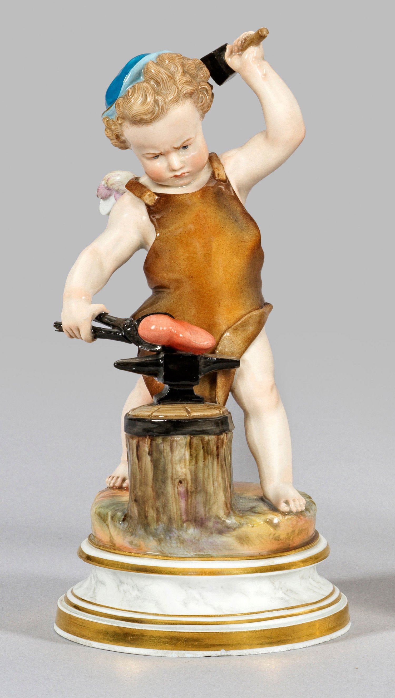 Auf profiliertem, marmoriertem Rundsockel mit felsigem Terrain stehender Amor, ein Herz auf einem Amboss schmiedend. Polychrome Malerei mit Gold. Entw. Heinrich Schwabe. Modell-Nr. L 114. Rest., best.; Schwertermarke. H. 17,5 cm.